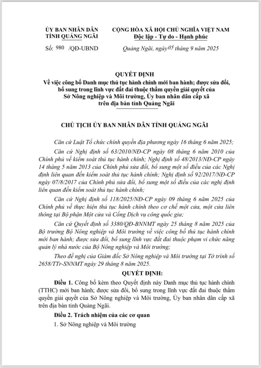 DANH MỤC THỦ TỤC HÀNH CHÍNH MỚI BAN HÀNH; ĐƯỢC SỬA ĐỔI, BỔ SUNG TRONG LĨNH VỰC ĐẤT ĐAI THUỘC THẨM QUYỀN GIẢI QUYẾT CỦA SỞ NÔNG NGHIỆP VÀ MÔI TRƯỜNG, UBND CẤP XÃ TRÊN ĐỊA BÀN TỈNH QUẢNG NGÃI