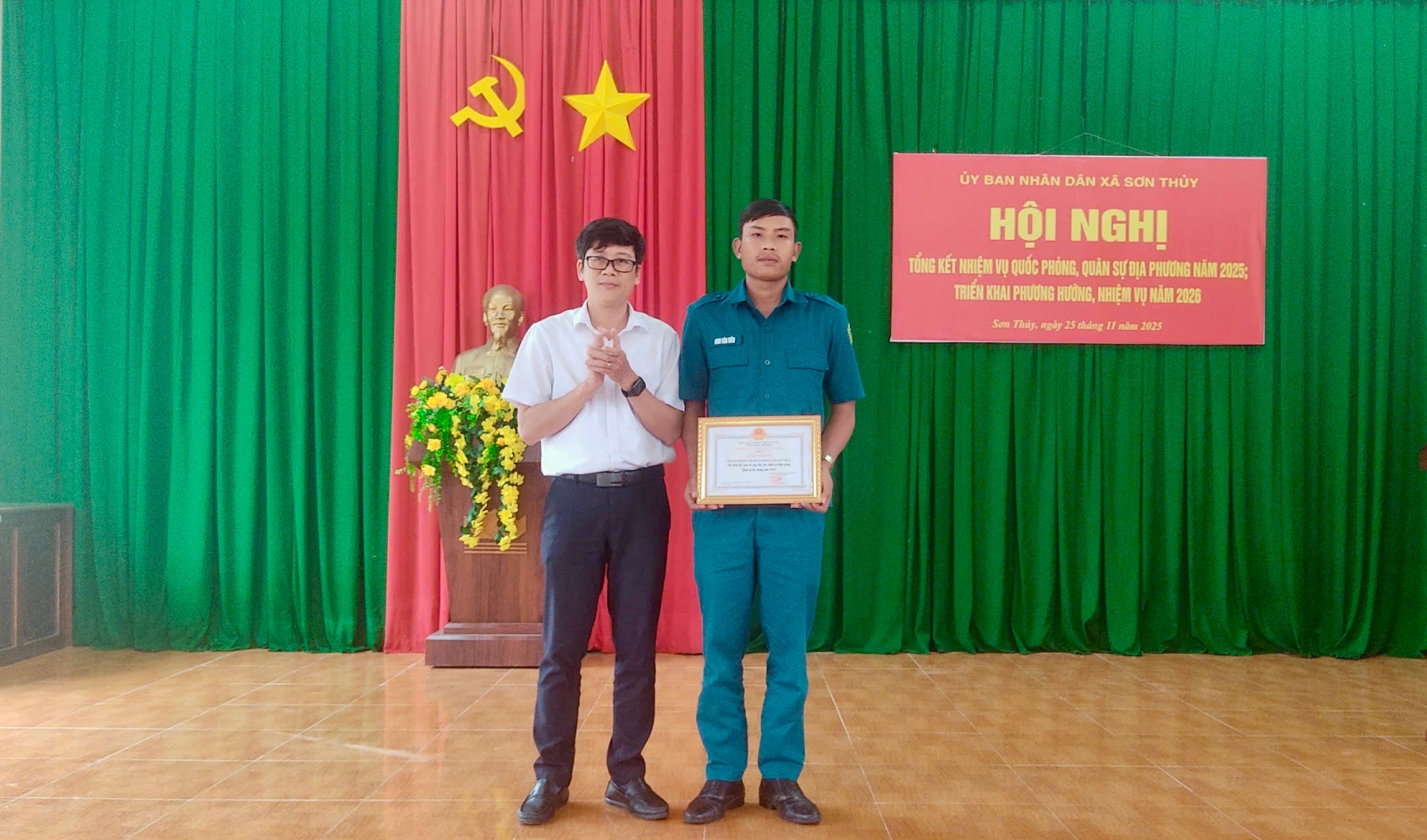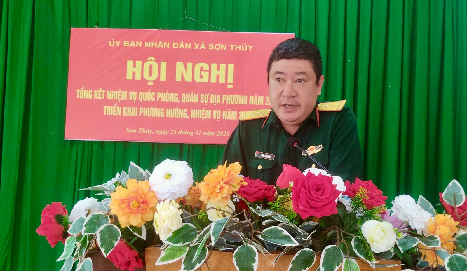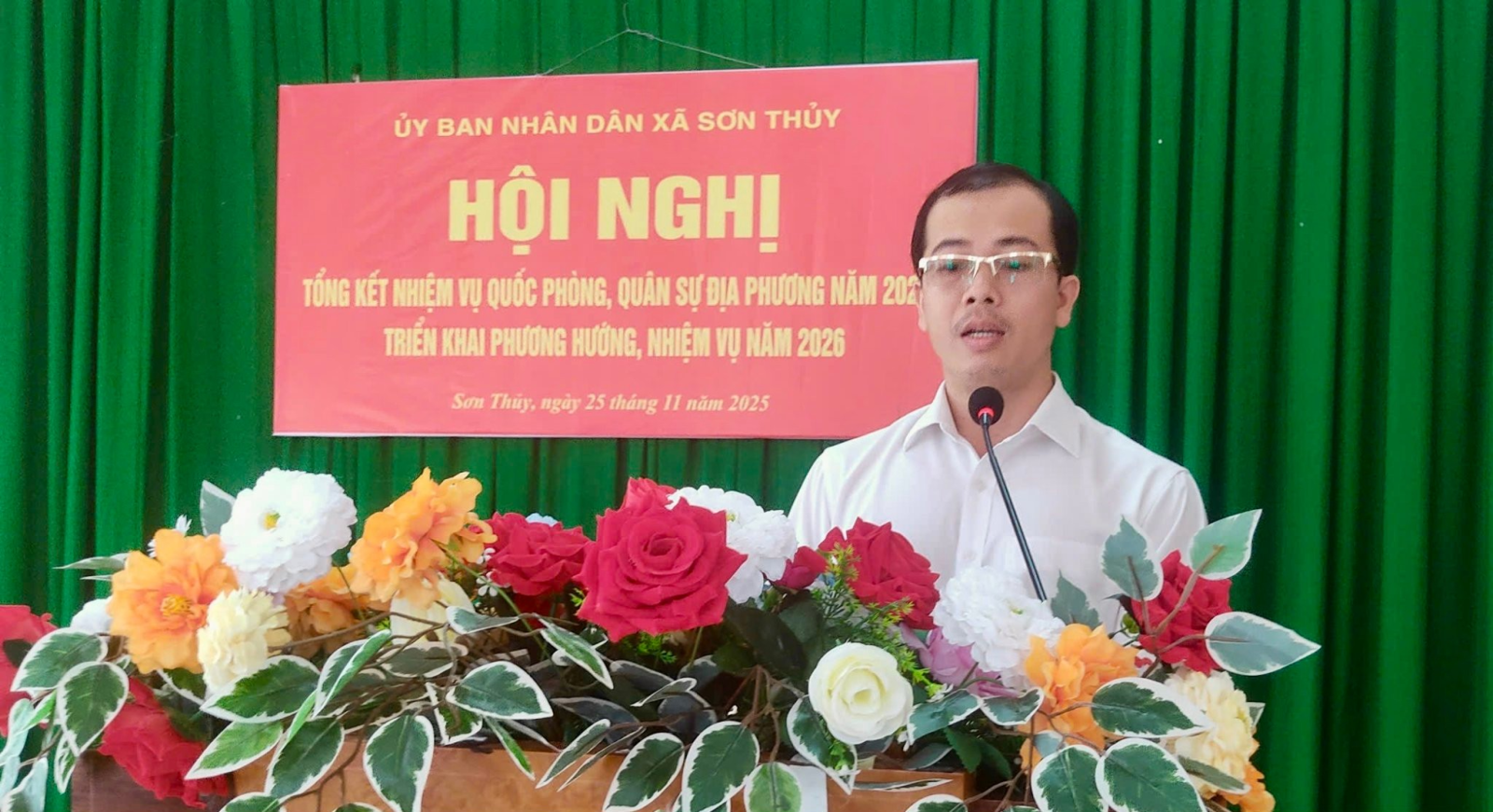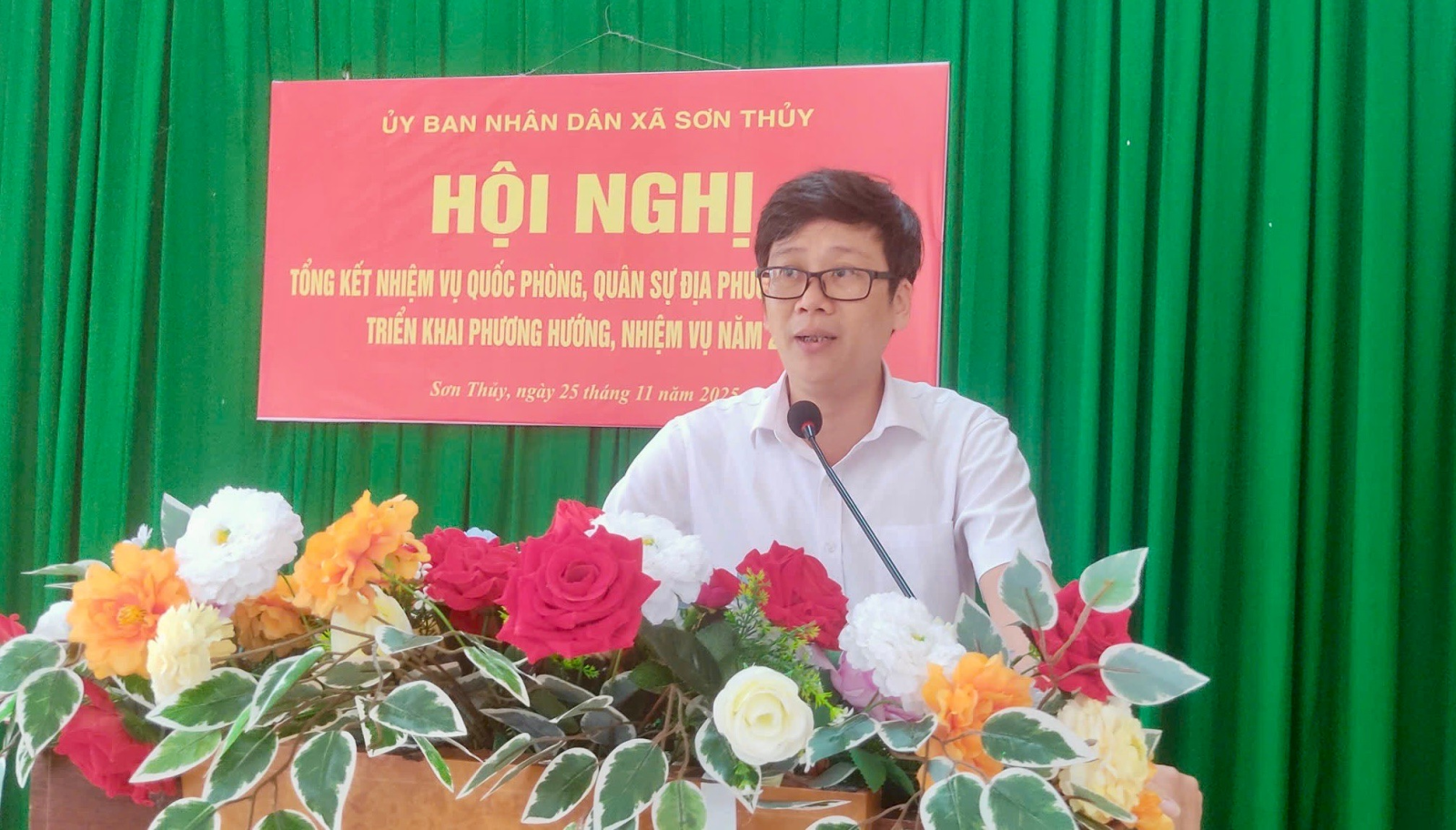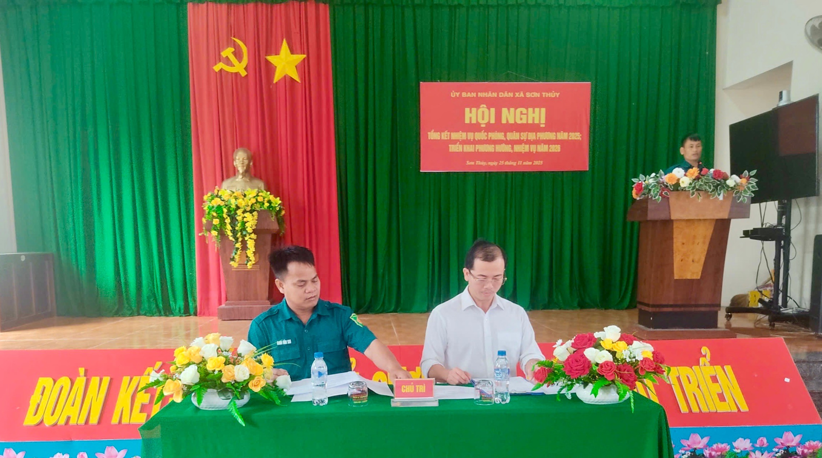 Sáng ngày 25/11/2025, tại Nhà Văn hoá xã Sơn Thuỷ, UBND xã Sơn Thủy tổ chức Hội nghị tổng kết nhiệm vụ quốc phòng, quân sự địa phương năm 2025; triển khai phương hướng, nhiệm vụ năm 2026. Về phía BCH Phòng thủ khu vực I có đồng chí Trung tá Đoàn Hữu Công – Phó tham mưu Trưởng BCH phòng thủ khu vực I, Sơn Tịnh; Về phía lãnh đạo địa phương có đồng chí Đoàn Văn Danh – Bí thư Đảng uỷ, Chủ tịch HĐND xã; đồng chí Lê Quốc Vũ – phó Bí thư, Chủ tịch UBND xã; đồng chí Đinh Văn Sui - UVBTV, Chỉ huy Trưởng BCH Quân sự xã, lãnh đạo UBMTTQ Việt Nam xã; cùng các ban, ngành, đoàn thể, lực lượng dân quân và trưởng thôn trên địa bàn.