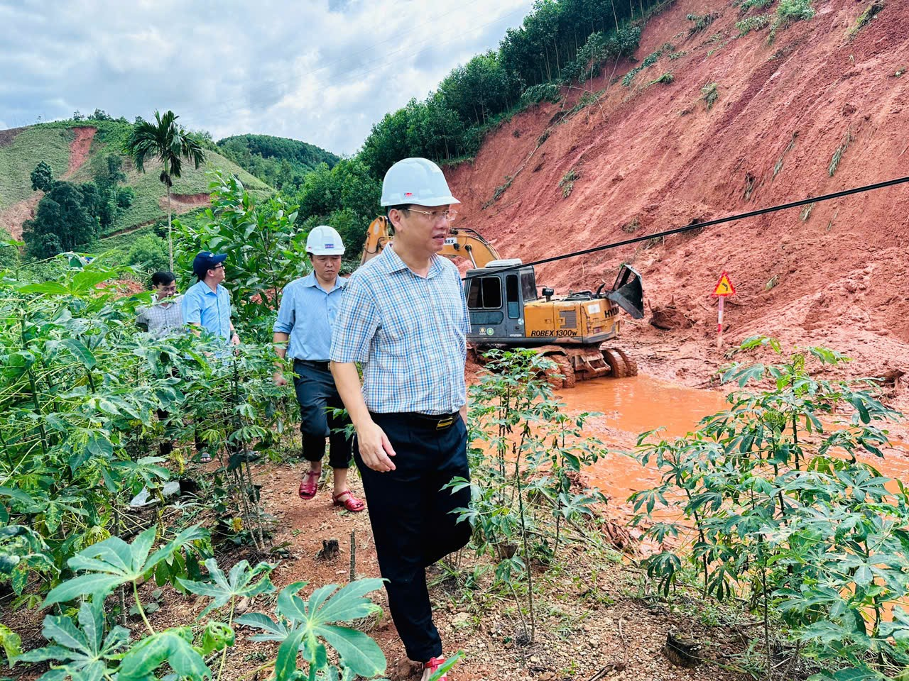 Đồng chí Nguyễn Công Hoàng, Phó Chủ tịch UBND tỉnh kiểm tra điểm sạt lở tại thôn Làng Đèo, xã Sơn Thủy