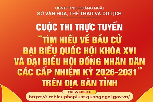 Thực hiện Công văn số 69/BTC ngày 09/01/2026 của Ban Tổ chức Cuộc thi tỉnh Quảng Ngãi; UBND xã Sơn Thủy thông báo và phát động đến toàn thể cán bộ, công chức, người lao động và nhân dân trên địa bàn tham gia Cuộc thi trực tuyến “Tìm hiểu về bầu cử đại biểu Quốc hội khóa XVI và đại biểu Hội đồng nhân dân các cấp nhiệm kỳ 2026-2031”.